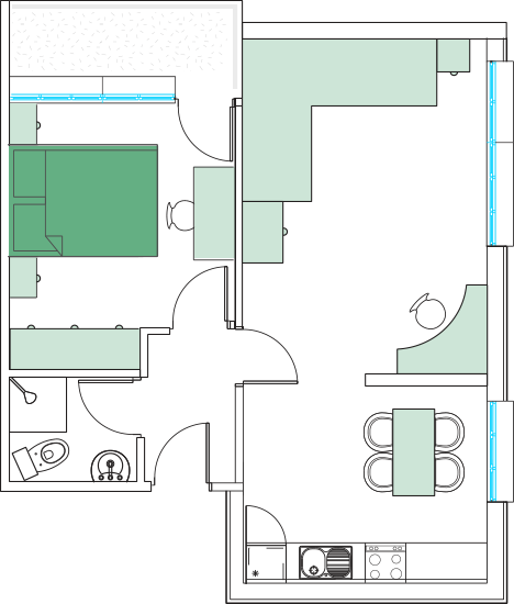Предлагаме 7 просторни двустайни апартамента с площ от 45-50кв.м. с тераси и изглед към парка на комплекса. Съобразени с удобството и нуждите на наемателите апартаментите могат да бъдат обособени с една спалня и една всекидневна или с две спални, като 4 от апартаментите разполагат с кухненски бокс и трапезария.